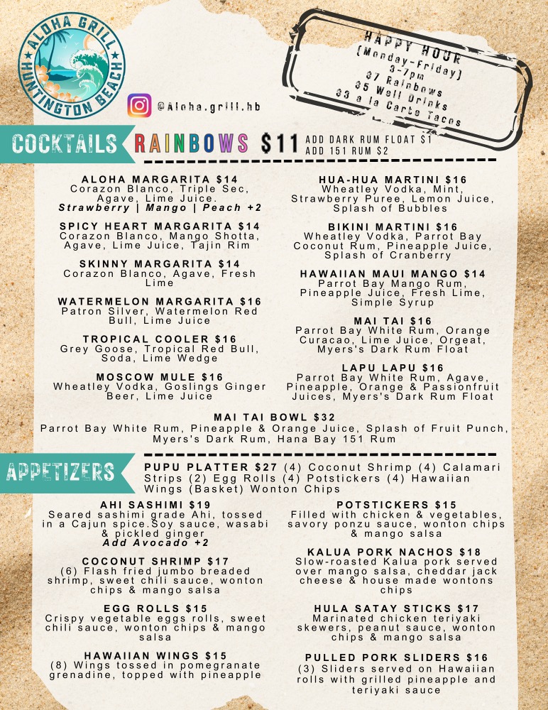 The menu at Aloha Grill reflects its relaxed, beach-town vibe with a mix of casual Hawaiian bites, bar favorites, and comforting dishes designed to suit both a quick snack or a laid-back meal with friends. You’ll find a variety of items that capture the flavors of the islands alongside familiar classics like burgers and fries, all served with a local twist.